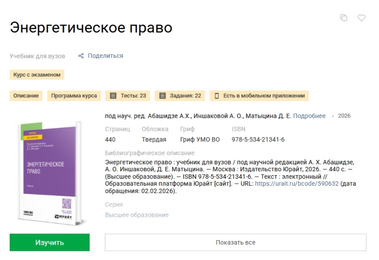Учебник и курс "Энергетическое право" теперь доступен на сайте Юрайт для изучения и приобретения. Материалы были подготовлены коллективом преподавателей, среди которых и преподаватели нашей кафедры - Гончаров А.И., Казаченок С.Ю., Квициния Н.В., Копьев А.В., Осадченко Э.О., Тарасова А.Г., Тымчук Ю.А.